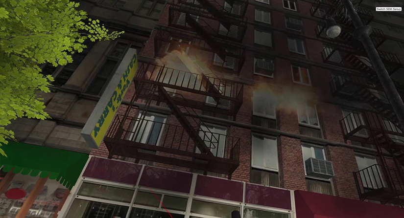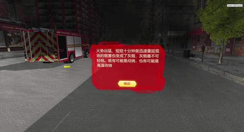 進入系統(tǒng)體驗場景,出現(xiàn)背景介紹UI,提示某居民樓起火,起火原因不明等;