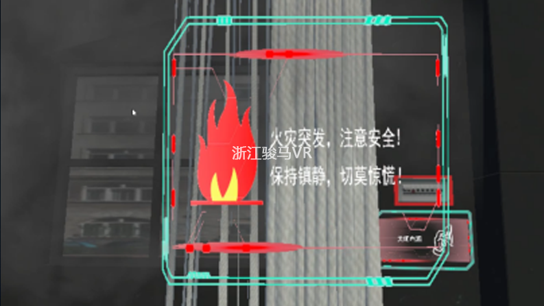 體驗(yàn)者戴上VR眼鏡后,系統(tǒng)進(jìn)入到歡迎頁(yè)面:VR高層住宅逃生體驗(yàn)系統(tǒng)。體驗(yàn)者正在高層住宅樓中,扣動(dòng)扳機(jī)點(diǎn)擊按鈕進(jìn)入體驗(yàn)。