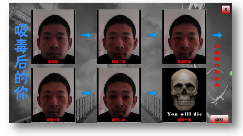 ★在屏幕上就會(huì)分別出現(xiàn)吸毒2年、吸毒4年、吸毒6年、8年后的吸毒面部變化。