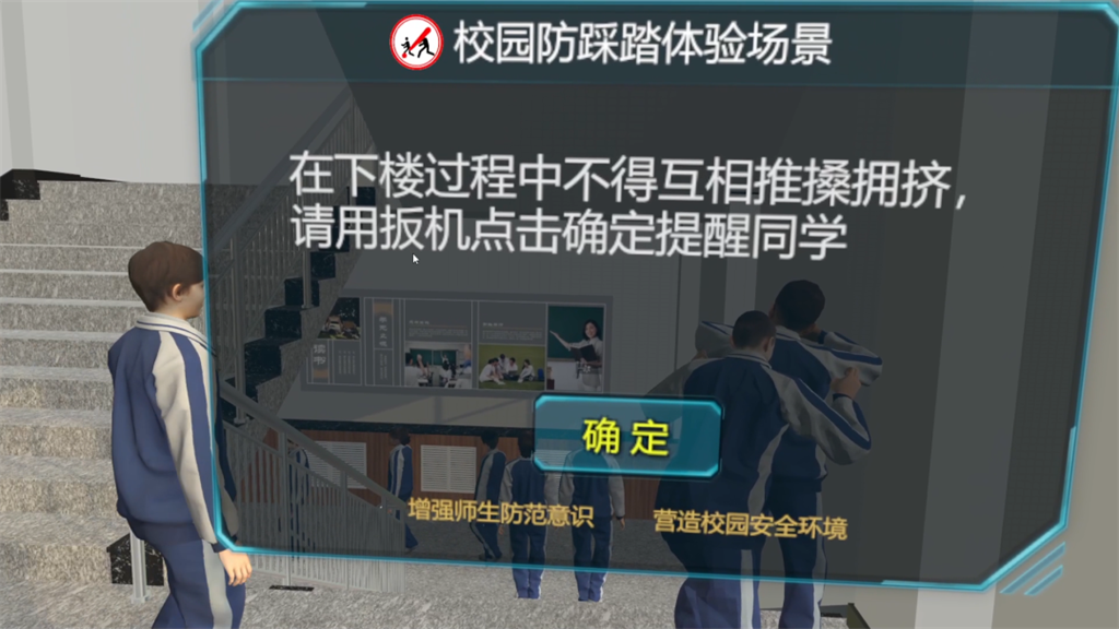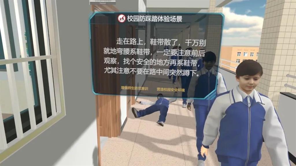 校園VR防踩踏體驗場景軟件從學校日常的早操入手,更具真實感與代入感;在校園早操準備過程中,學生們需集體前往操場,期間有同學在彎腰系帶、樓道走廊內亂竄打鬧、人群擁擠處彎腰下蹲撿東西、在人流處逆向跑步、在下樓樓梯時互相推操擁擠、在下樓樓梯發(fā)生意外跌倒后,后面未知的人群依然涌動前行的狀況。