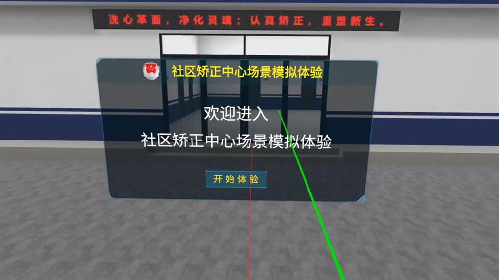 進入VR場景,體驗者站在社區(qū)矯正中心大門前,點擊手柄即可進入內(nèi)部。大廳內(nèi),系統(tǒng)語音隨即介紹中心的主要職責與區(qū)域劃分。隨后,體驗者可自由漫游至各功能室,系統(tǒng)會詳細介紹每室的功能及在社區(qū)矯正中的作用。此外,大廳還設(shè)有互動答題環(huán)節(jié),增強體驗趣味性與知識性。