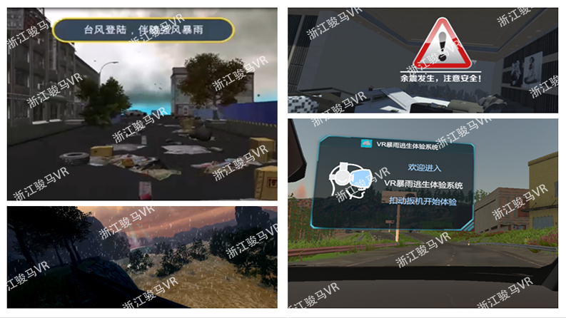 自然災(zāi)害體驗系統(tǒng)中包含了“VR泥石流災(zāi)害自救與逃生”、“VR臺風(fēng)天氣預(yù)防”、“VR暴風(fēng)雨逃生演練系統(tǒng)”、“VR地震逃生體驗”等。讓體驗者在各不同場景中學(xué)習(xí)如何應(yīng)對自然災(zāi)害等突發(fā)事件,如何進(jìn)行安全預(yù)防避險等安全知識。