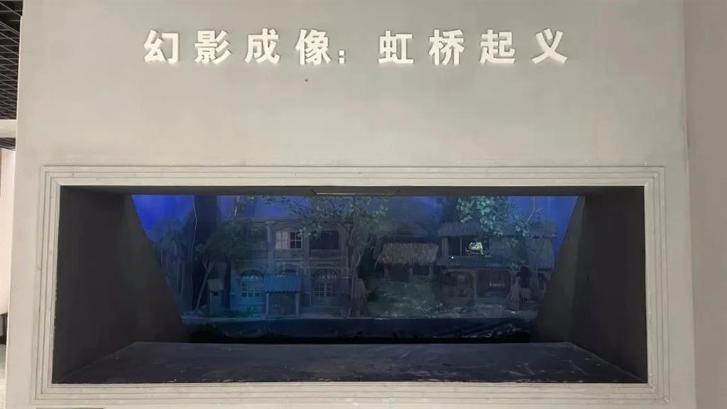 幻影成像系統(tǒng),呈現(xiàn)虹橋起義的內(nèi)容展現(xiàn)。利用多機(jī)多方位攝像技術(shù)及人眼視覺心理特性,再將所拍攝區(qū)域?qū)⑼队爱嬅嫱渡湓谔刂泼浇椴A?,與實(shí)景模型結(jié)合,合成最終3D畫面,演繹出虹橋起義故事。